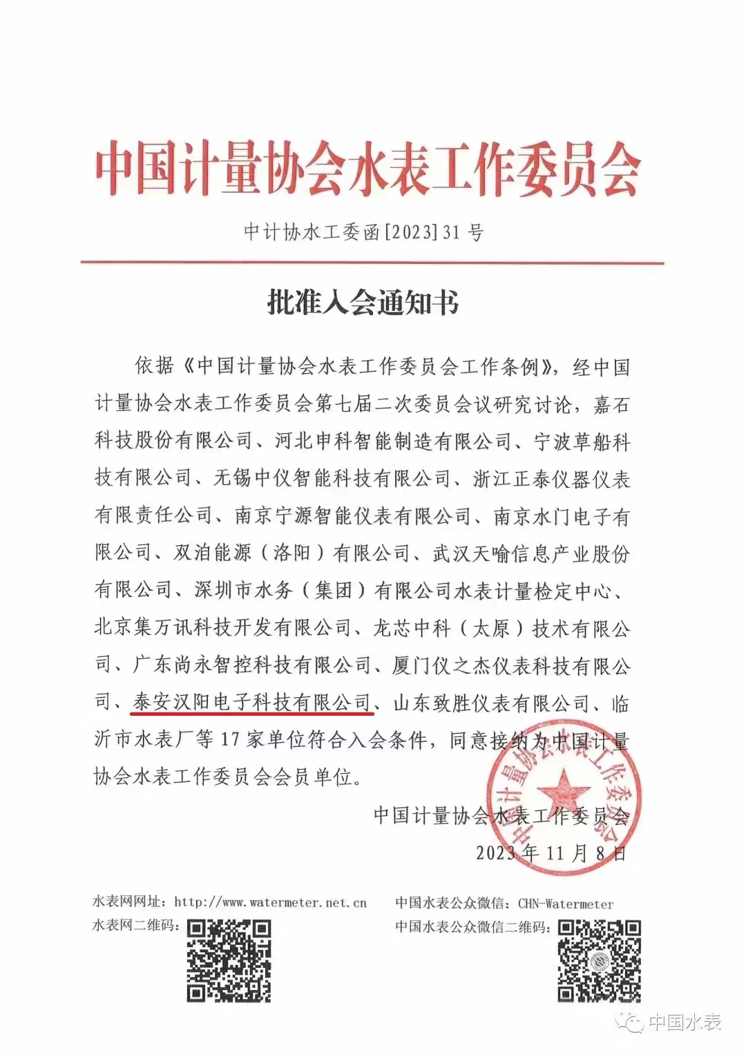泰安漢陽加入中國計(jì)量協(xié)會